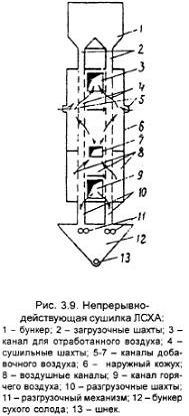 Общее пребывание солода в сушилке (считая время прохода его через загрузочные и разгрузочные шахты) составляет 9,5-10 ч. Высушенный солод непрерывно удаляется при помощи разгрузочного механизма 11 в бункер 12. Непрерывно-действующая сушилка ЛCXA имеет ряд преимуществ по сравнению с обычной вертикальной сушилкой: сокращается время сушки, производительность на единицу объема в два-три раза выше, расход топлива ниже на 20-30%; непрерывность процесса позволяет упростить контроль и полностью автоматизировать процесс сушки.