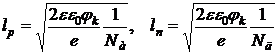 гдеε- относительная диэлектрическая проницаемость материала полупроводника;ε0 - диэлектрическая постоянная вакуума; NAи ND-концентрация акцепторов и доноров. Из формулы (2) видно, что ширинаp-n-перехода зависит от концентраций акцепторов и доноров.