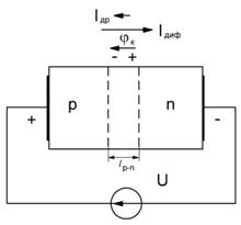 ) напряженность электрического поля на p-n-переходе убывает и возобновляется процесс диффузии основных носителей заряда.Ток диффузии, ток основных носителей заряда, становится много больше дрейфового тока. Таким образом, через p-n-переход протекает прямой ток равный