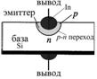 Полупроводниковый диод представляет собой полупроводниковый кристалл с двумя слоями проводимости (р-n-переход), заключенный в корпус и два вывода для присоединения его к электрической цепи.Схематическое устройство плоскостного диода показано на рисунке 9а. Один из способов изготовления таких диодов следующий. На поверхности полупроводникой пластины с электронной проводимостью площадью 2-4 мм2 и толщиною в несколько десятых долей миллиметра расплавляют маленький кусочек индия (акцептор). Атомы индия диффундируют в пластинку, образуя область с дырочной проводимостью. Между двумя областями полупроводника с различным типом проводимости возникает p-n-переход. Одна из областей р-n-структуры, называемая эмиттером, имеет большую концентрацию основных носителей заряда, чем другая область, называемая базой.