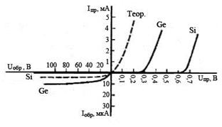 Рисунок 10 - Вольтамперные характеристики для германиевого (Ge) и кремниевого(Si)диодов. Пунктиром показана теоретически рассчитанная характеристика p-n перехода