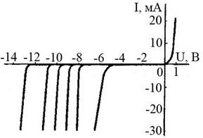 Лавинный пробой связан с образованием лавины носителей зарядов под действием сильного электрического поля. В результате ударной ионизации заряды приобретают энергию, достаточную для образования новых электронно-дырочных пар. Напряженность электрического поля при этом должна достигать (8-12)•104 В/см. Такая напряженность возникает при обратном напряжении более6 - 7 В. Количество носителей, уходящих с перехода при пробое, оказывается больше количества носителей поступающих в переход, что приводит к резкому возрастанию обратного тока (рисунок 12).