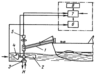 глубины русла, измерителя скорости 4 с гидрофлюгером 2, индукционного датчика 5