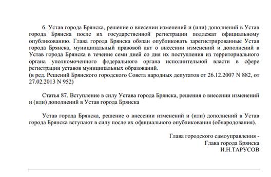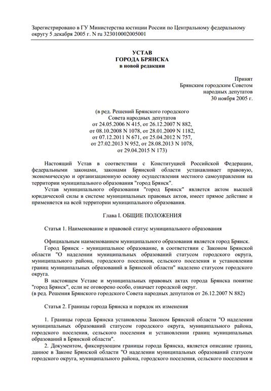 . Устав города Брянска, принят Решением Брянского городского Совета народных депутатов 5.02.1997 г. - Брянск. - Архив Брянского городского Совета народных депутатов.