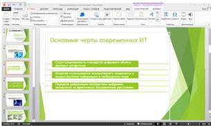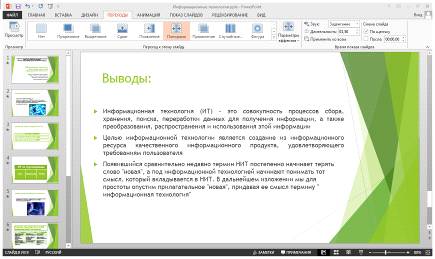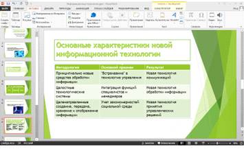 В презентации я постаралась использовать все технологии, предоставляемые средствами PowerPoint 2013, насколько это было целесообразно для создания презентации на тему: "Информационные технологии. Характерные черты новой информационной технологии.". Я использовала такие технологии, как настройку временного интервала между слайдами, таблицы, диаграммы, рисунки SmartArt, средства анимации, звук, выбор темы, заголовочный слайд, и др.