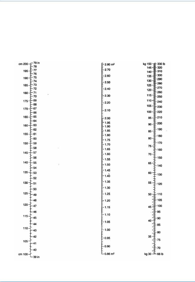 Примечания: Для получения площади поверхности тела пациента соедините значения его роста и массы прямой линией, точка пересечения прямой со средней шкалой будет площадью поверхности тела пациента. * — Lentner C. Geigy Scientific Tables: Units of Measurement, Body Fluid, Composition of Body, and Nutrition (8th ed.). Basel, Switzerland: Novartis Medical Education. 1981.
