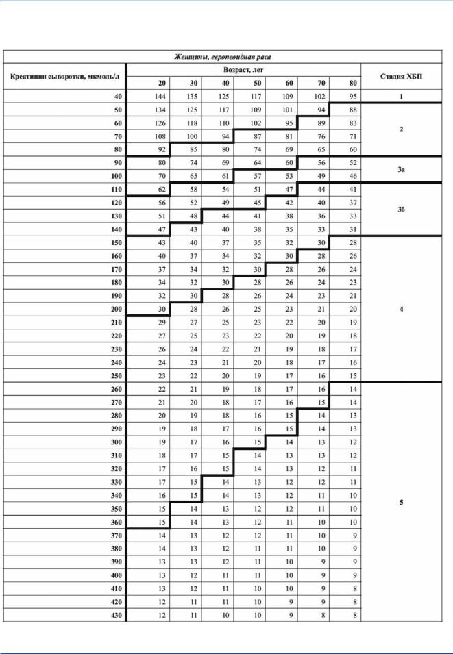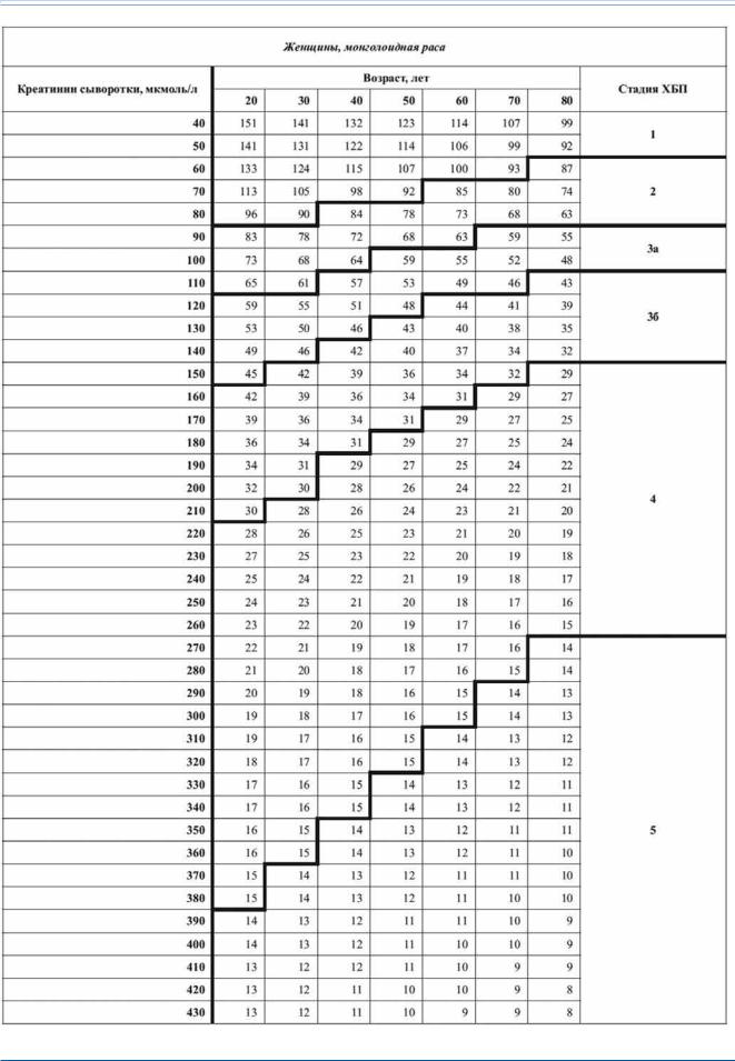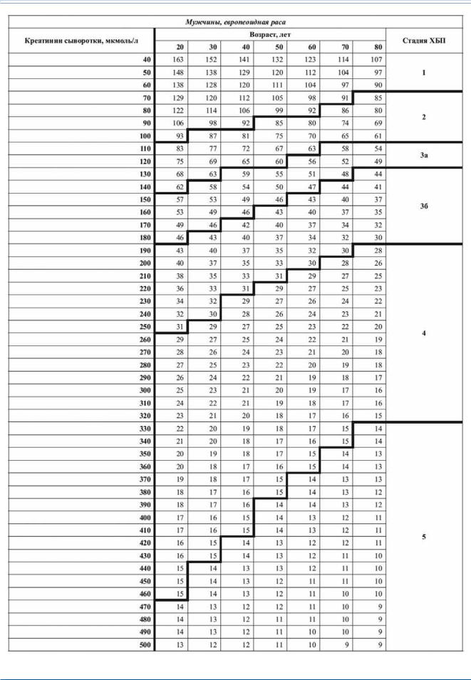 Приложение 3. Номограмма определения стадии хронической болезни почек по формуле CKD-EPI [http://medpro.ru/ groups/khronicheskaya_bolezn_pochek_prilozhenie]