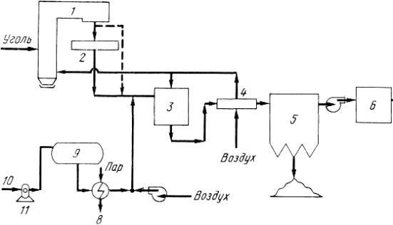 1 — топка котла; 2 — экономайзер; 3 — реактор; 4 — теплообменник для нагрева воздуха; 5 — электрофильтр; 6 — блок обессеривания топочного