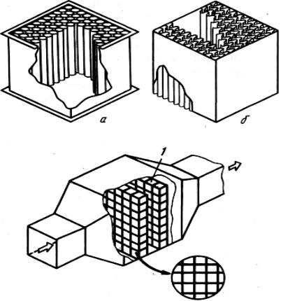 б — сотовая, с использованием гофрированных металлических пластин.