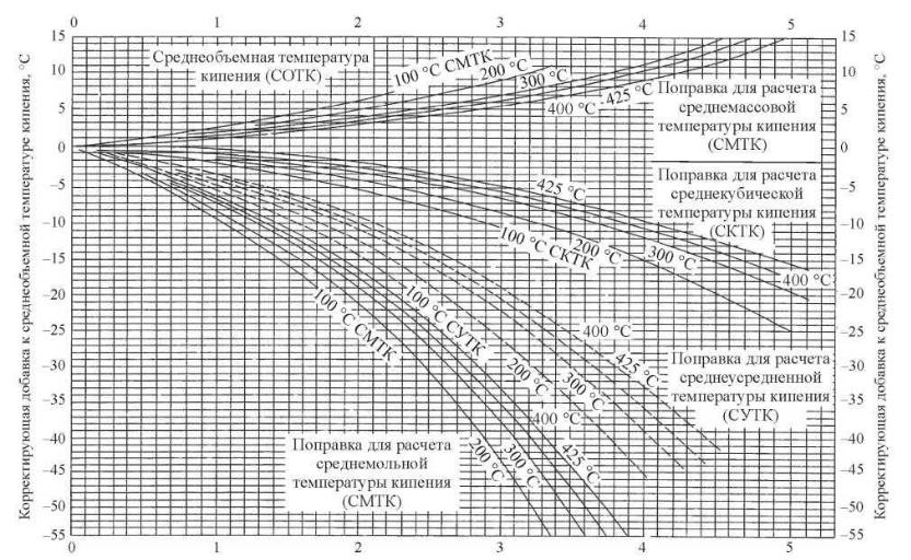 Вместе с тем среднеобъемную (СОТК), среднемассовую (СМТК), среднемолекулярную (СМТК), среднекубическую (СКТК) и среднеусредненную (СУТК) температуры кипения можно определить, используя номограммы и графики.