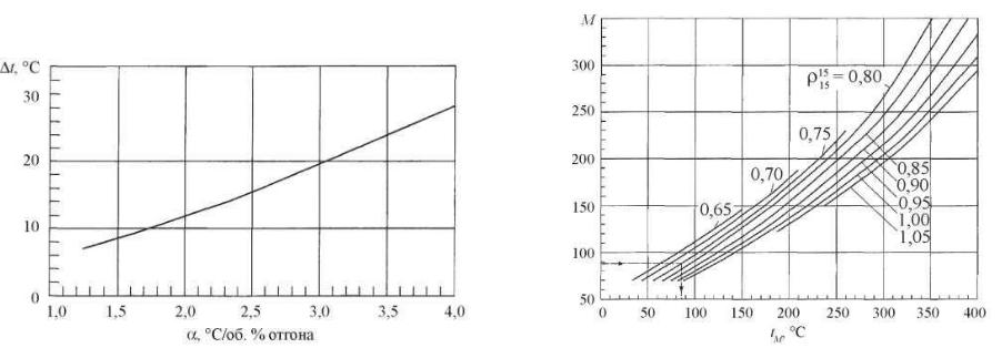 Температуры кипения – tср.мол, tcp. масс, tср. куб, tср. уср – можно определить по номограмме на рисунке 1 в зависимости от tcр.об и угла наклона кривой разгонки (α). Значение α рассчитывают по формуле