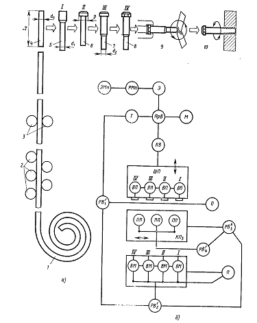 Рисунок 5 - Технологическая схема изготовления болта с граненой головкой на четырехпозиционном автомате-комбайне (а) и структурная схема (б) четырехпозиционного автомата для холодной объемной штамповки стержневых деталей: