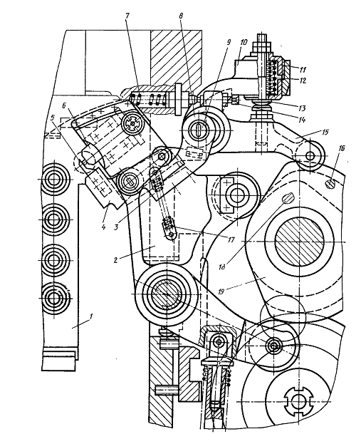 Для повышения качества поверхности торца отрезаемой заготовки механизм отрезки автомата этой модели выполнен с прижимом прутка или проволоки в процессе отделения. Механизм отрезки работает следующим образом (рис. 7). Отрезной нож 6, закрепленный на рычаге 2, после окончания подачи материала до регулируемого упора перемещается влево для отрезки заготовки и переноса ее на первую (верхнюю) позицию штамповки в матричном блоке 1. Движение рычага 2 осуществляется от кулаков 18 и 19. При отрезке заготовки планка 5 прижимает материал к ножу 6 с помощью рычага 4, поворот которого осуществляется от эксцентрика 9 и ролика 8. Качание эксцентрика происходит от кулака 16 рычагами 10 и 15. Сила прижима рычага 15к кулаку 16 осуществляется пружиной 12 и регулируется гайкой и винтами 11 и 13 Пружина 7 оказывает давление па рычаг 15 через регулировочный винт 14.