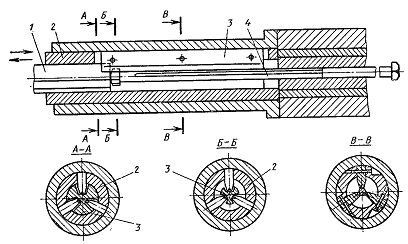 перемещается в призмах 3,собранных в обойме 2, толкателем 1.