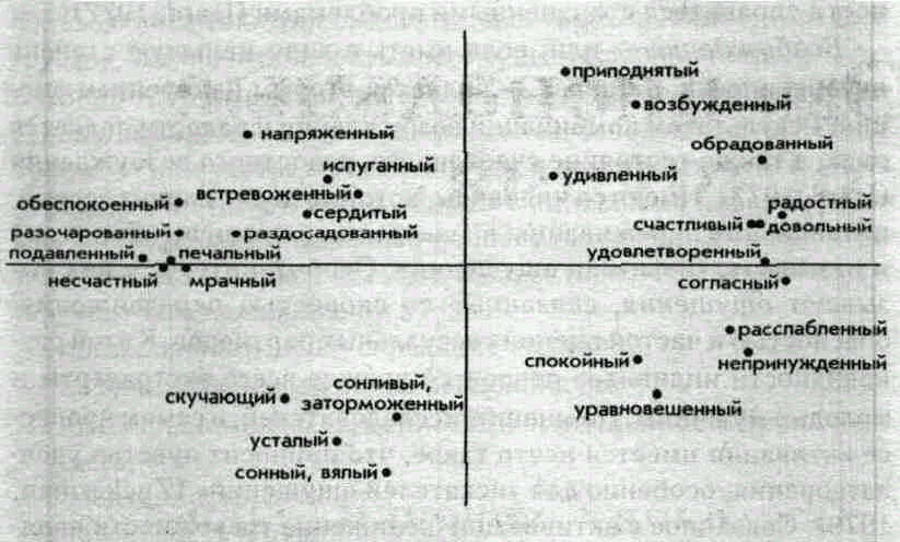 Один из типичных примеров подобных исследований дан на рис. 1. Аналогичные результаты были позднее получены в исследованиях, выполненных в самых различных культурных средах [33]. Вышеупомянутое исследование, а также многие другие дают основание для утверждения, что существуют два основных диапазона эмоциональных проявлений: приятно—неприятно (иначе говоря, счастливый—печальный) и активация—торможение (или степень интереса и возбужденности). Эти два измерения остаются в силе и для эмоциональной экспрессии, проявления чувств, например, мимики. Обнаружено, что эти два измерения являются функцией двух совершенно разных нейрофизиологических систем. Однако, как мы уже видели, анализ данных самоотчета показывает, что положительные и отрицательные эмоции в определенных условиях могут определяться независимыми факторами [36].