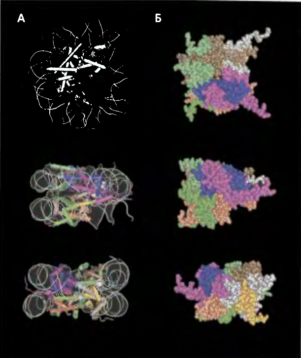 нуклеосомы (А) и октамера гистонов (Б) в трех разных ракурсах.Разные молекулы