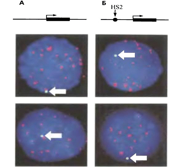 На рис. показаны результаты визуализации интегрированной в геном трансгенной конструкции в ядрах эритроидных клеток. Для гибридизации с трансгеном использовался зонд, меченный зеленым красителем; красным красителем помечен зонд, позволяющий визуализировать все центромеры (этот зонд гибридизуется с центромерами всех хромосом). Синяя флуоресценция - краситель DAPI, неспецифически окрашивающий тотальную ДНК. Позиции трансгенов отмечены белыми стрелками. Конструкция, в состав которой входит только ген β-глобина (А), локализуется преимущественно возле центромер. Так как центромеры содержат гетерохроматин, то и трансген оказывается гетерохроматинизирован и репрессирован. Включение же в конструкцию энхансера HS2 из области контроля локуса β-глобинового домена (Б) приводит к тому, что такой трансген локализуется преимущественно в эухроматических областях ядра. Никакой гетерохроматинизации не происходит и трансген активно экспрессируется.
