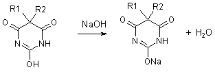 барбитуровой кислоты. В присутствии гидроксид-ионов они диссоциируют как
