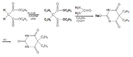 Схема синтеза барбитала выглядит следующим образом: