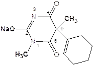 натрия 1,5-диметил-5-(циклогекс-1¢-енил)-барбитурат натрияБелая пенообразная масса, на воздухе от CO2 разлагается. Гигроскопичен. Очень легко растворим в воде и спирте; практически нерастворим в эфире и хлороформе |