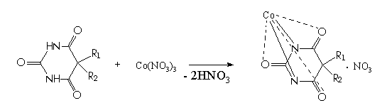 1. Производные барбитуровой кислоты образуют нерастворимые соли с ионами тяжелых металлов - серебра, ртути (II), меди (II), кобальта (II). Эта реакция происходит только с ионизированной формой препарата, поэтому кислотную форму предварительно необходимо перевести в ионную [8]. Однако при этом нельзя допускать избытка щелочи, так как он при последующем выполнении реакции приведет к образованию гидроксидов металлов [12].