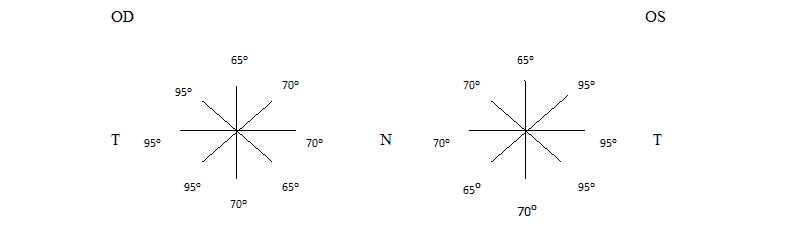 OD: Окружающие глаз ткани не изменены. Положение глазного яблока в орбите правильное. Глазная щель миндалевидной формы. Положение век и рост ресниц правильные. Слезные ручейки не расширены. Слезные точки погружены в слезное озеро. При надавливании на область слезного мешка отделяемого из слезных точек нет. Конъюнктива век бледно-розового цвета, гладкая, влажная, блестящая. Конъюнктива глазного яблока прозрачная, гладкая, блестящая. Склера белого цвета. Роговица прозрачная, гладкая, влажная, блестящая, зеркальная, бессосудистая, сферичная, высокочувствительная, в диаметре 11 мм. Передняя камера средней глубины, влага ее прозрачная. Радужка синего цвета, рисунок её чёткий. Зрачок круглый, в диаметре 3 мм. Пигментная зрачковая кайма сохранена. Прямая и содружественные реакции зрачка на свет сохранены. Хрусталик прозрачный, положение его правильное. Стекловидное тело прозрачное. На глазном дне диск зрительного нерва бледно-розового цвета с четкими границами, калибр сосудистого пучка не изменен. В макулярной области и на периферии глазного дна патологических изменений не обнаружено.