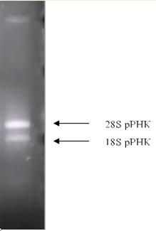 Суммарную клеточную РНК выделяли методом фенол-хлороформной экстракции [8] со следующими модификациями. Для ингибирования РНКаз на стадии получения клеточного лизата использовали 42,6% гуанидин тиоцианат. Очистку РНК проводили при помощи осаждения хлоридом лития. Качественный анализ препаратов РНК проводили путём неденатурирующего электрофореза в 1% (в/о) геле агарозы при напряжённости электрического поля 7 В/см. Окрашивание геля производилось 0,1% водным раствором бромистого этидия. Визуализация результатов проводилась с использованием трансиллюминатора с длиной волны 312 нм. Результаты фиксировались цифровой видеокамерой Samsung и обрабатывались с помощью пакета программ Gel Explorer 1.0.