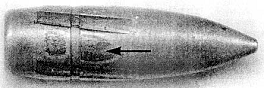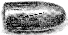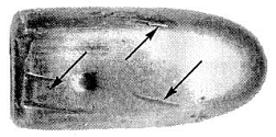 Рис. 7.6. Пуля калибра 7,62 мм, выстреленная из оружия калибра 9 мм (стрелками указаны следы полей нарезов)