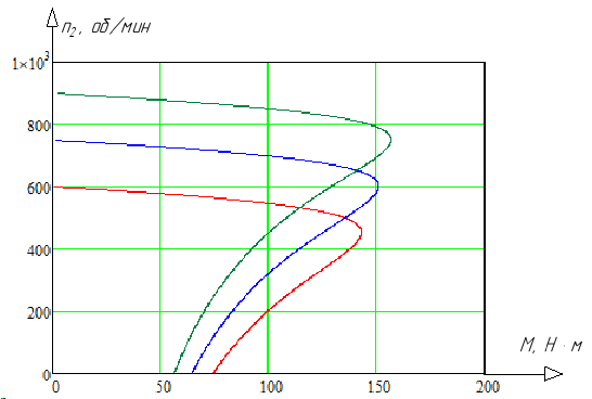 Получаем зависимость частоты вращения ротора от электромагнитного момента при f1>f1н, f1н, f1<f1н.