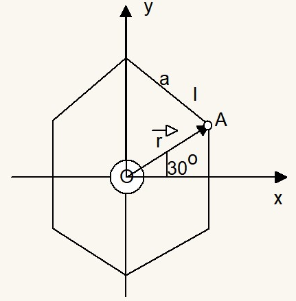 Определить напряженность электрического поля в точке, равноудаленной от сторон шестиугольной равносторонней рамки, имеющей заряд, равномерно распределенный с линейной плотностью τ= 10 нКл/м. Сторона рамки 10 см.