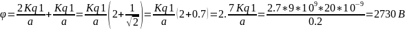 В трех вершинах квадрата со стороной 20 см расположены одинаковые по величине и знаку точечные заряды по 20 нКл каждый. Определить потенциал в свободной вершине квадрата.