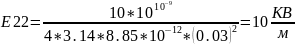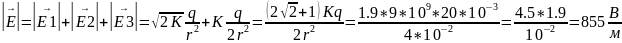 В трех вершинах квадрата со стороной 20 см расположены одинаковые по величине и знаку точечные заряды по 20 нКл каждый. Определить напряженность в свободной вершине квадрата.