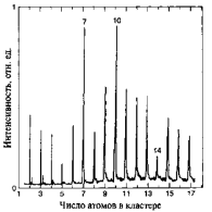 На рис. 3 показаны данные масс-спектроскопии кластеров свинца, полученных в таком эксперименте. Количество ионов данной массы представлено как функция количества атомов в кластере. (Обычно масс-спектр представляют в виде зависимости количества частиц от отношения массы к заряду) Из этих данных видно, что кластеры из 7 и 10 атомов более вероятны, чем другие. Это означает, что такие кластеры более стабильны, чем кластеры других размеров.