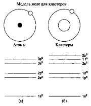 На рис. 5 показаны схемы энергетических уровней атома водорода и системы со сферически симметричным распределением положительного заряда. Верхние индексы относятся к количеству электронов, заполняющих данный энергетический уровень. Электронные магические числа соответствуют полному количеству электронов суператома, при которых верхний энергетический уровень заполнен до конца. Заметим, что порядок уровней в модели желе отличается от такового в атоме водорода. В этой модели магические числа соответствуют кластерам с такими размерами, при которых все уровни, на которых есть электроны, заполнены до конца.