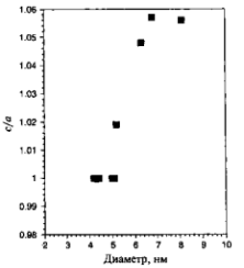На рис. 7 показана зависимость с/а от диаметра частицы индия. Следует отметить, что структура изолированной наночастицы может отличаться от лиганд-стабилизированной структуры. Лиганд-стабилизацией называется присоединение неметаллических ионных групп к металлическим атомам или ионам. Изменение структуры может отразиться на многих свойствах, в частности — на электронной структуре.
