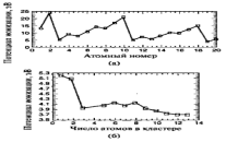 На рис. 4(а) показан график потенциала ионизации атомов как функция их атомного номера Z, равного количеству протонов в атоме. Ионизационный потенциал — это энергия, которую необходимо передать атому для удаления из него внешнего электрона. Максимальным потенциалом ионизации обладают атомы благородных газов 2Не, 10Ne и 18Аг, так как у них внешние s и р орбитали заполнены. На рис. 4(6) показана зависимость потенциала ионизации кластера натрия в зависимости от количества находящихся в нем атомов. Чаще всего в потоке кластеров встречаются кластеры, состоящие из определенного числа частиц, что означает, что эти кластеры наиболее устойчивы, стабильны. Пики наблюдаются для кластеров, имеющих два и восемь атомов. Эти числа называют электронными магическими числами. Их наличие позволяет рассматривать кластеры как суператомы, что и обусловило появление для кластеров "модели желе". В случае больших кластеров. Стабильность определяется атомной структурой, а магические числа называются структурными магическими числами.