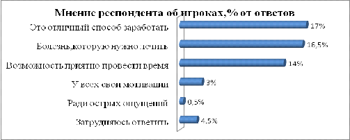 ) Играют в азартные игры практически все респонденты (95-98%), однако на сегодняшний день играют часто (ежедневно и 1-2 раза в неделю) лишь каждый четвертый опрошенный. Рейтинг наиболее популярных азартных игр возглавляют карточные игры. Мотивом игры для большинства игроков (50%) является выигрыш.