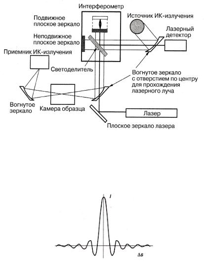 На рис. 4 представлена принципиальная схема ИК-Фурье спектрометра. Важными элементами конструкции интерферометра являются неподвижное и подвижное зеркала и светоделитель. Светоделитель расщепляет поступающее от источника излучение на две равные части, которые направляются в разные стороны. Одна часть света попадает на неподвижное зеркало, другая — на подвижное (сканер). После отражения зеркалами обе части излучения вновь объединяются тем же самым светоделителем. На оптическом пути между светоделителем, образцом и детектором оказывается излучение из обоих плеч интерферометра. Результатом измерения является функция зависимости интенсивности излучения от изменения длины пути Δs подвижного зеркала. Эта функция называется интерферограммой.