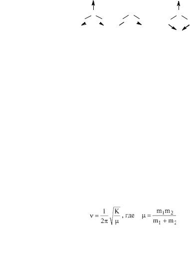 С увеличением числа атомов в молекуле число возможных колебаний быстро растет. В реальной молекуле колебания атомов тесно связаны друг с другом и взаимодействуют между собой. Спектры молекул представляют собой сложный набор различных колебаний, каждое из которых проявляется в узком интервале частот. Общее число линий (полос поглощения) в спектре, связанных с колебаниями атомов, определяется для нелинейной молекулы формулой 3n—6 основных колебаний и 3n—5 для линейной молекулы, где n — число атомов в молекуле. Например, трехатомная молекула воды имеет три вида колебаний — два валентных (симметричное и асимметричное) и одно деформационное (рис. 2).