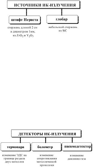 Глобар представляет собой стержень, изготовленный из карбида кремния. Рабочая температура глобара 1300 К. Штифт Нернста — стержень, изготовленный из оксида цикрония (IV) с примесью оксидов иттрия, тория и церия. Рабочая температура — 1700 К.