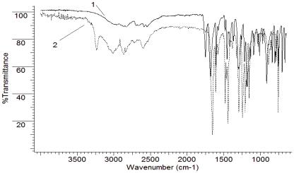 Рис. 6. ИК спектры стандартного образца ацетилсалициловой кислоты (1) и фальсифицированной субстанции (2)