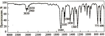 Пример 1. Проведите отнесение полос поглощения в ИК спектре ацетофенона С6Н5–СО–СН3 к колебаниям соответствующих функциональных групп и структурных фрагментов.