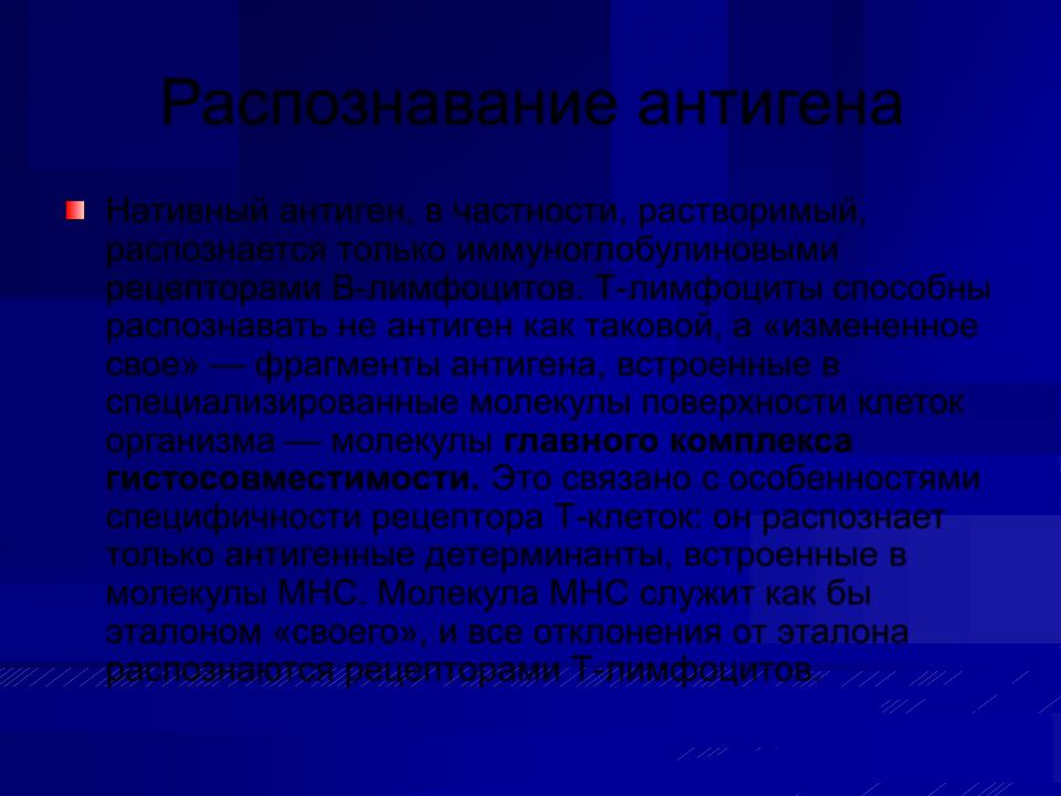 Нативный антиген, в частности, растворимый, распознается только иммуноглобулиновыми рецепторами В-лимфоцитов. Т-лимфоциты способны распознавать не антиген как таковой, а «измененное свое» — фрагменты антигена, встроенные в специализированные молекулы поверхности клеток организма — молекулы главного комплекса гистосовместимости. Это связано с особенностями специфичности рецептора Т-клеток: он распознает только антигенные детерминанты, встроенные в молекулы МНС. Молекула МНС служит как бы эталоном «своего», и все отклонения от эталона распознаются рецепторами Т-лимфоцитов.