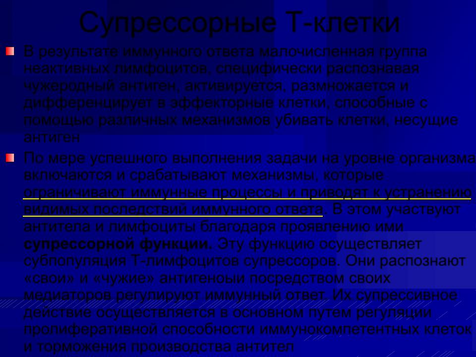 антитела и лимфоциты благодаря проявлению ими супрессорной функции. Эту функцию осуществляет субпопуляция Т-лимфоцитов супрессоров. Они распознают «свои» и «чужие» антигеноыи посредством своих медиаторов регулируют иммунный ответ. Их супрессивное действие осуществляется в основном путем регуляции пролиферативной способности иммунокомпетентных клеток и торможения производства антител