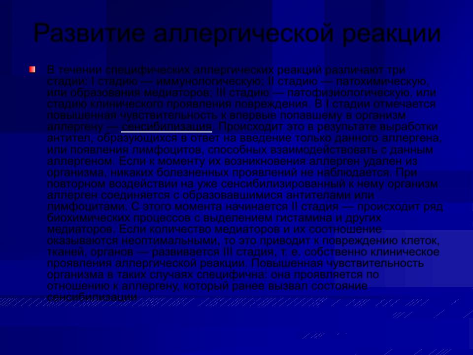 В течении специфических аллергических реакций различают три стадии: I стадию — иммунологическую; II стадию — патохимическую, или образования медиаторов; III стадию — патофизиологическую, или стадию клинического проявления повреждения. В I стадии отмечается повышенная чувствительность к впервые попавшему в организм аллергену — сенсибилизация. Происходит это в результате выработки антител, образующихся в ответ на введение только данного аллергена, или появления лимфоцитов, способных взаимодействовать с данным аллергеном. Если к моменту их возникновения аллерген удален из организма, никаких болезненных проявлений не наблюдается. При повторном воздействии на уже сенсибилизированный к нему организм аллерген соединяется с образовавшимися антителами или лимфоцитами. С этого момента начинается II стадия — происходит ряд биохимических процессов с выделением гистамина и других медиаторов. Если количество медиаторов и их соотношение оказываются неоптимальными, то это приводит к повреждению клеток, тканей, органов — развивается III стадия, т. е. собственно клиническое проявления аллергической реакции. Повышенная чувствительность организма в таких случаях специфична: она проявляется по отношению к аллергену, который ранее вызвал состояние сенсибилизации