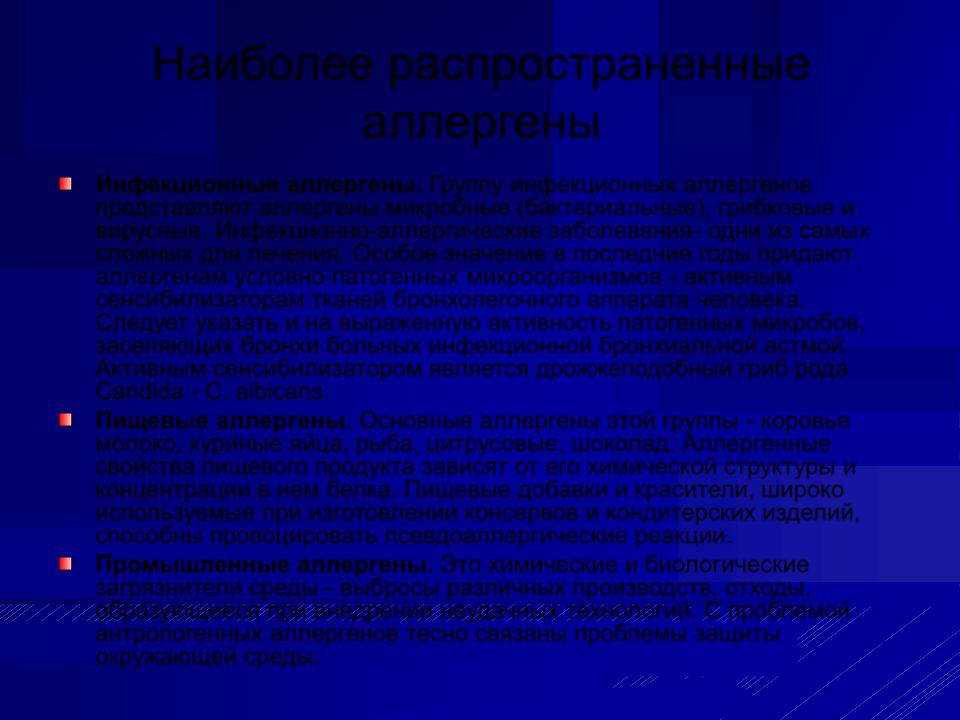 Инфекционные аллергены. Группу инфекционных аллергенов представляют аллергены микробные (бактериальные), грибковые и вирусные. Инфекционно-аллергические заболеванияодни из самых сложных для лечения. Особое значение в последние годы придают аллергенам условно-патогенных микроорганизмов - активным сенсибилизаторам тканей бронхолегочного аппарата человека. Следует указать и на выраженную активность патогенных микробов, заселяющих бронхи больных инфекционной бронхиальной астмой. Активным сенсибилизатором является дрожжеподобный гриб рода