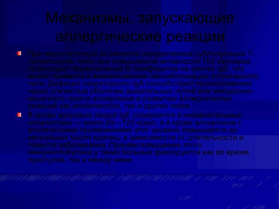 При недостаточной активности определенной субпопуляции Т- супрессоров, либо при повышенной активности Th2 хелперов происходит переключение В-лимфоцитов на синтез IgE, что может привести к возникновению сенсибилизации атопического типа. Дефицит секреторного IgA способствует проникновению через слизистые оболочки дыхательных путей или желудочнокишечного тракта аллергенов и развитию аллергических реакций как атопического, так и других типов.