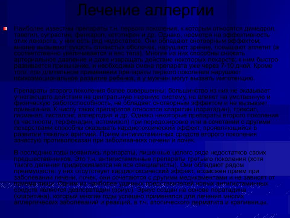 физическую работоспособность, не обладает снотворным эффектом и не вызывает привыкания. К числу таких препаратов относятся кларитин (лоратадин), трексил, гисманал, гисталонг, аллергодил и др. Однако некоторые препараты второго поколения (в частности, терфенадин, астемизол) при передозировке или в сочетании с другими лекарствами способны оказывать кардиотоксический эффект, проявляющийся в развитии тяжелых аритмий. Прием антигистаминных средств второго поколения зачастую противопоказан при заболеваниях печени и почек.