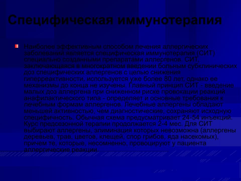 специфичность. Обычная схема предусматривает 24-54 инъекций. Курс предсезонной терапии продолжается 2-4 мес. Для СИТ выбирают аллергены, элиминация которых невозможна (аллергены деревьев, трав, цветов, клещей, спор грибов, яда насекомых), причем те, которые, несомненно, провоцируют у пациента аллергические реакции.