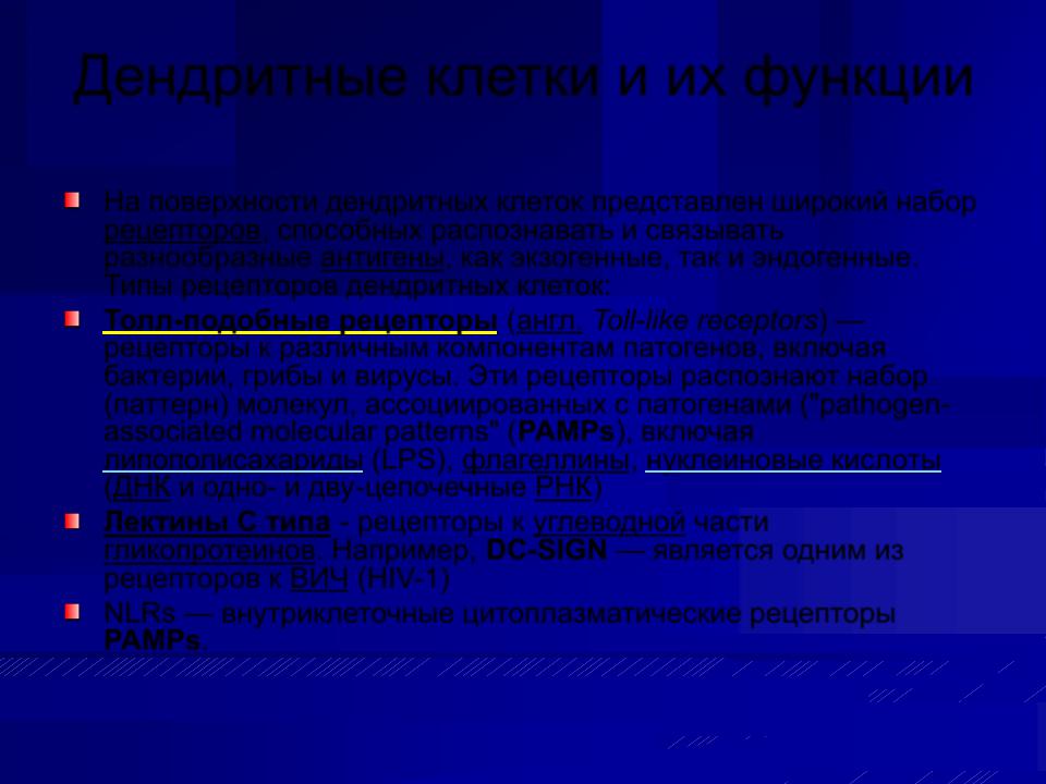 На поверхности дендритных клеток представлен широкий набор рецепторов, способных распознавать и связывать разнообразные антигены, как экзогенные, так и эндогенные. Типы рецепторов дендритных клеток: